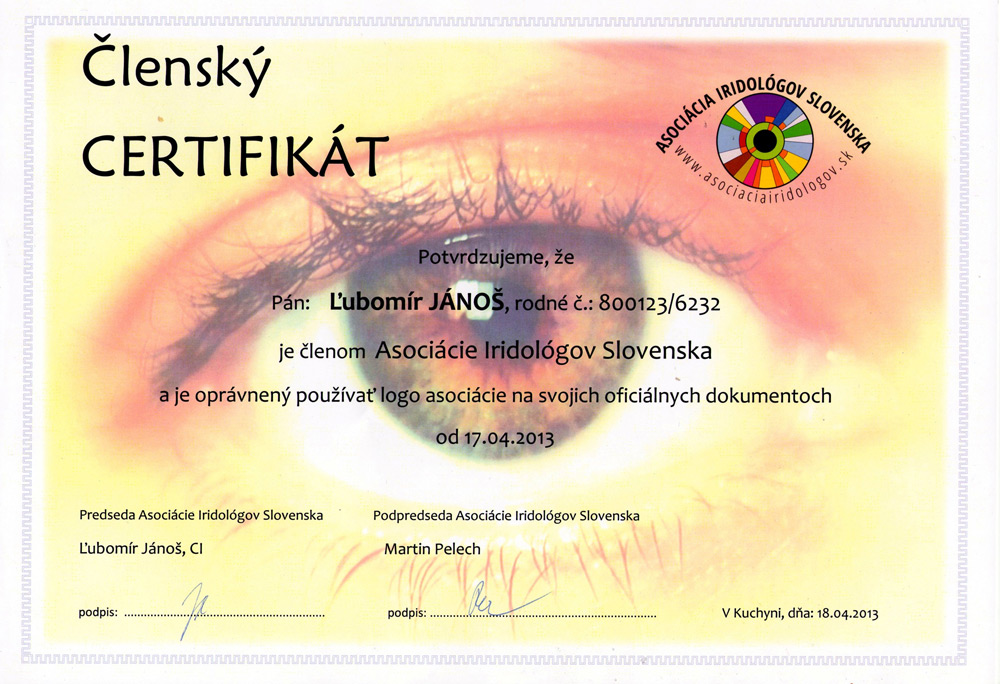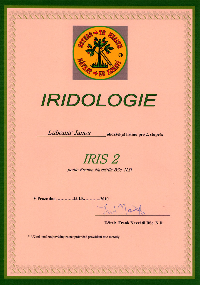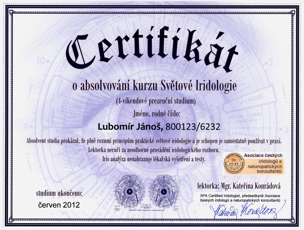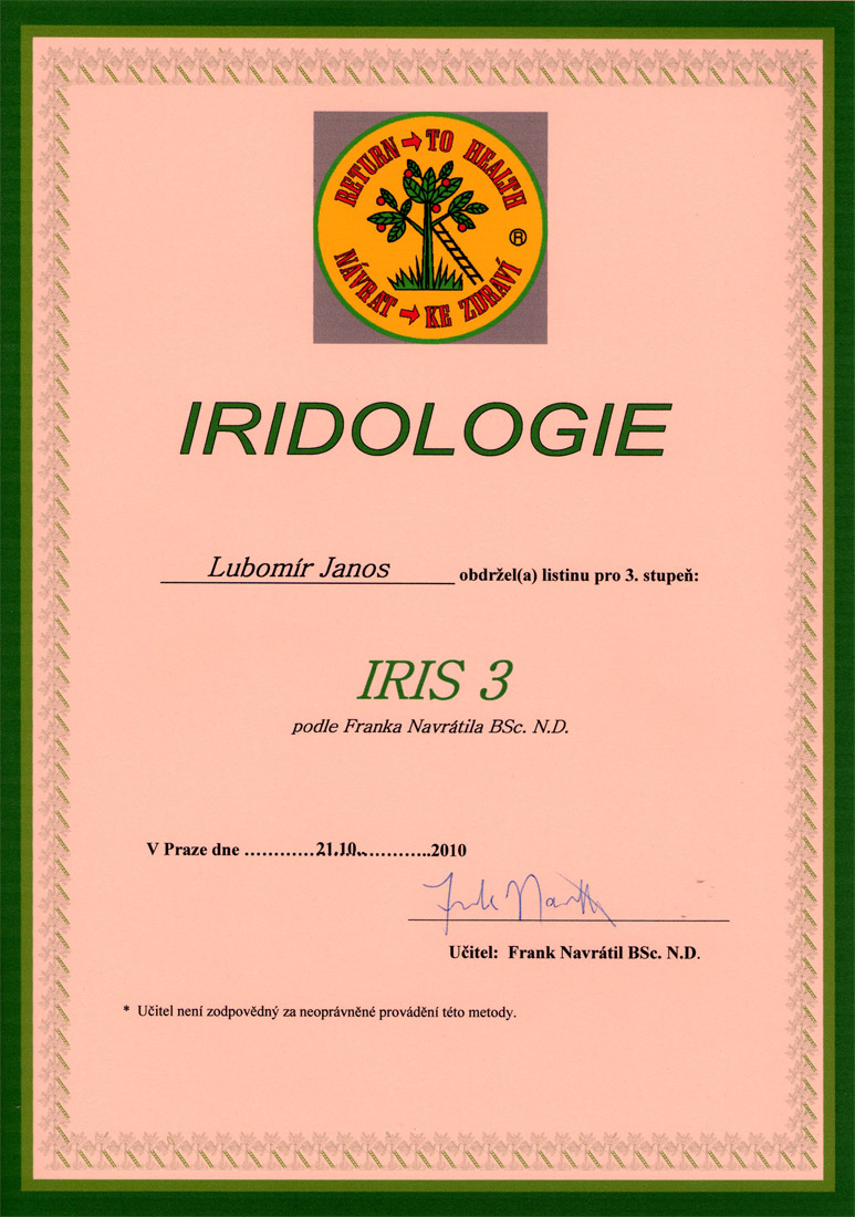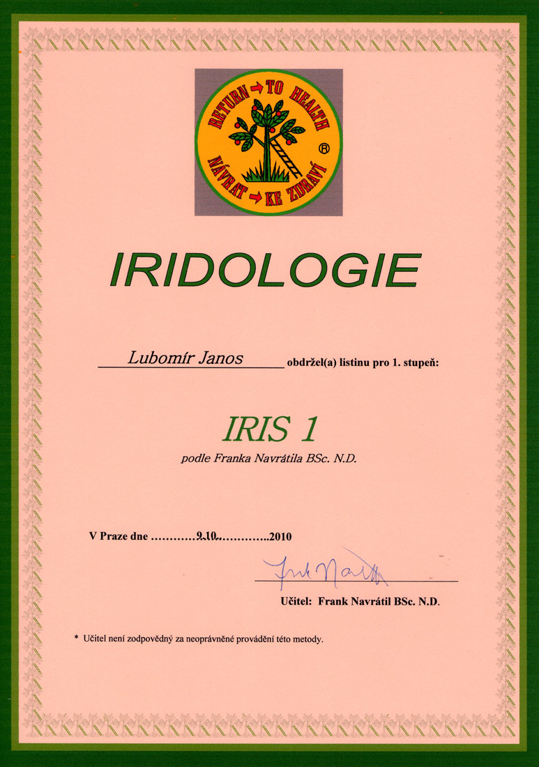 Irisdiagnostikou sa zaoberám od r. 2001. Absolvoval som viaceré iridologické školenia a kurzy a tiež kurz Medzinárodnej iridológie, akreditovaný Medzinárodnou asociáciou praktických iridológov (International Iridology Practicioners Asociacion - IIPA).